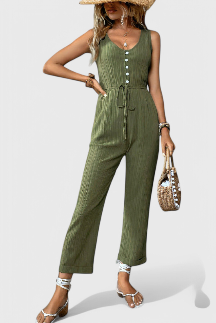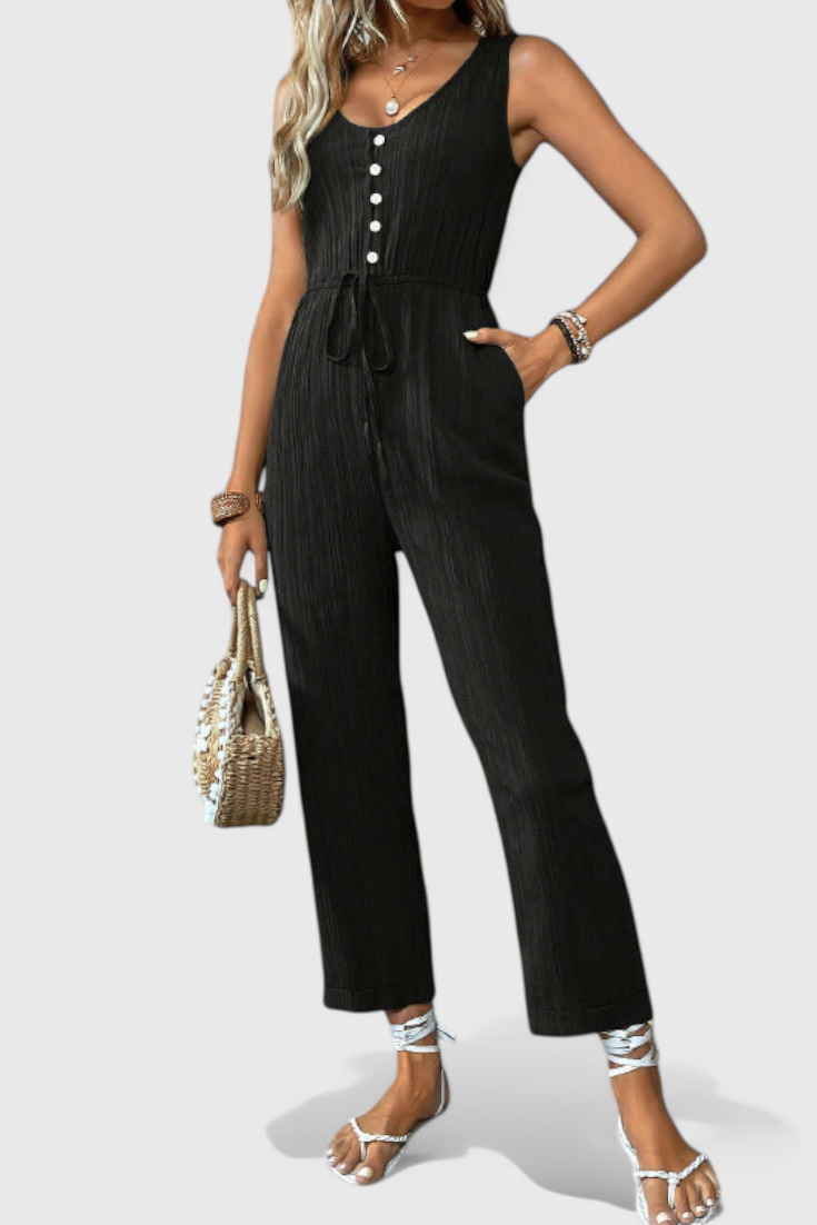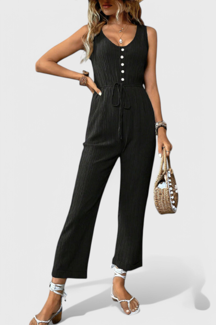 Blizgus, kvėpuojantis ir begalinis universalumas—Marisela yra jūsų pasirinkimas be pastangų elegancijoje. Pagamintas iš tekstūruotos medvilnės mišinio, šis be rankovių mono siūlo patogią V formos iškirptę, apibrėžtą juosmenį su diržu ir tiesų, švarų siluetą. Nesvarbu, ar einate į pusryčius, ar rengiatės vasaros vakaro renginiui, jis užtikrina komfortą su šiuolaikiška rafinuotumu.