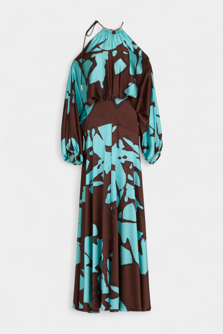 Eterinė elegancija su šiuolaikiniu prisilietimu. Suknelė Monte išsiskiria lengvu siluetu, atviro tipo rankovėmis ir abstrakčiu raštu kontrastingomis spalvomis, kurios sugauti šviesą su kiekvienu judesiu. Jos iškirptė su metaliniu akcentu ir prigludusi juosta formuoja stilizuotą figūrą su charakteriu ir rafinuotumu.
