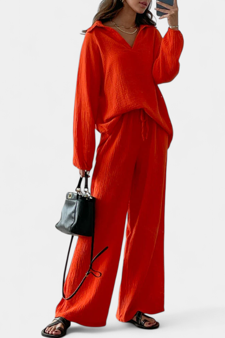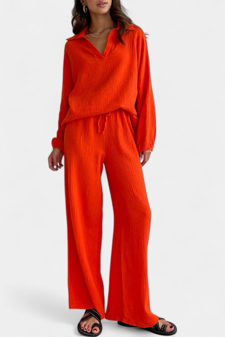 Šiuolaikinis komfortas su atsipalaidavusiu prisilietimu. Aya komplektas išsiskiria lengvu medvilnės audiniu, patogiu V-formos iškirpimu ir laisvu siluetu, kuris lengvai prisitaiko prie bet kurios šiltos dienos. Jo dviejų dalių dizainas sukuria suderintą ir laisvą išvaizdą, idealiai tinkamą laisvai ir gaiviai judėti, kur tik eini.