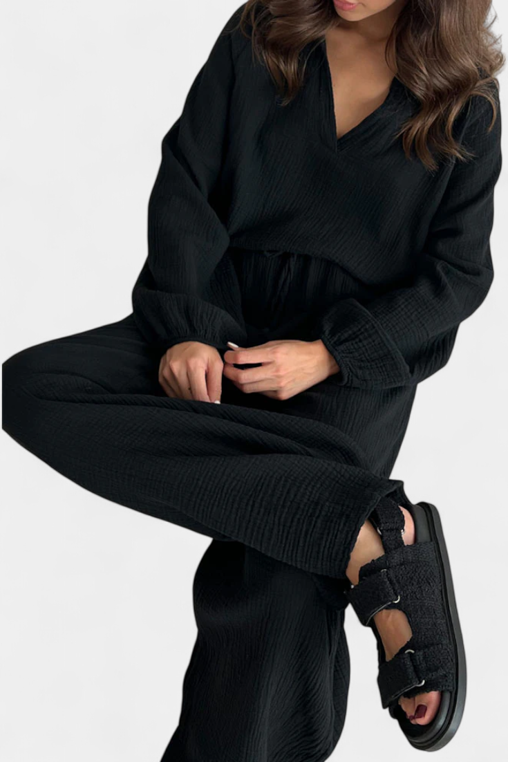 • Dizainas: V-formos iškirptė, ilgos rankovės, laisvos kelnės