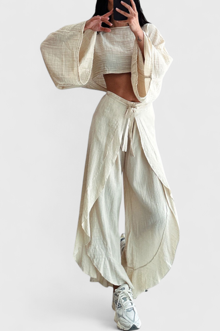 Patogumas su drąsiu akcentu. Maeva komplektas sujungia trumpą, laisvą topą su šoniniu atvartu ir laisvas aukšto juosmens kelnes su juostele liemenyje, siūlydamas modernią ir universalią siluetą. Jo lengvas audinys ir minkštas kritimas daro jį idealiu pasirinkimu stilingoms atsipalaidavusioms dienoms.